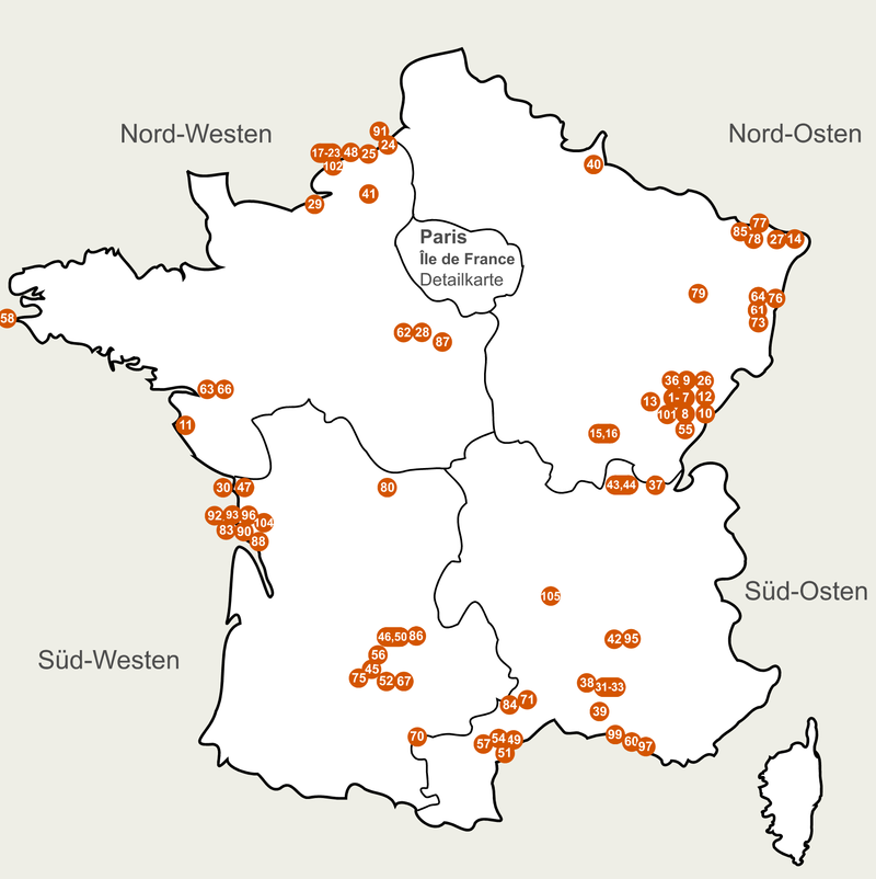 Es sind hier nur Artikel zu denjenigen Regionen aufgeführt, die in der Übersichtskarte „Frankreich“ und der Detailkarte „Paris, Île de France“ genannt werden. Zu anderen Bereichen (z. B. „Literatur“) siehe oben im Hauptmenü.